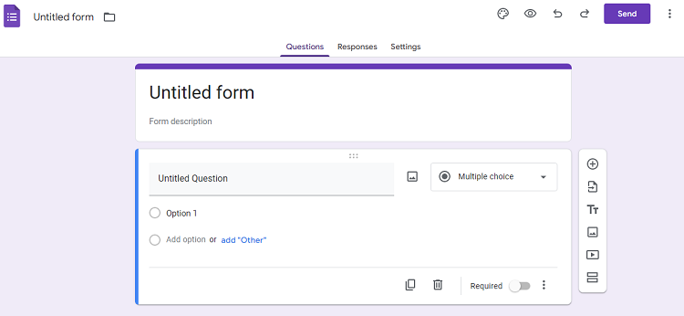 با انتخاب گزینه Blank اما خود شما باید فرم را ایجاد کنید. پس از کلیک روی این گزینه، پنجره زیر باز میشود. در اینجا و قسمت Untitled form میتوانید عنوان فرم خود را تایپ کنید و در بخش Form description نیز توضیحاتی برای آن بنویسید.