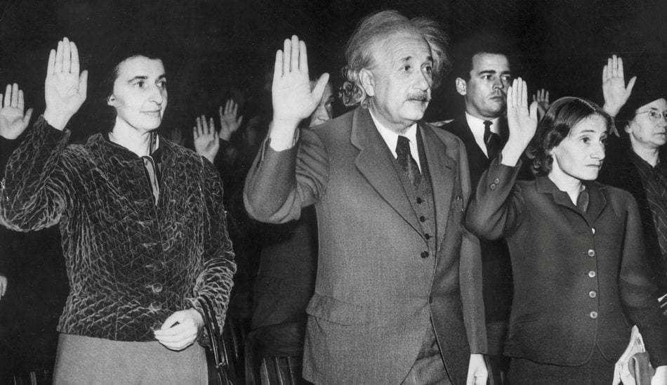 انیشتین در سال 1935 توانست اقامت دائم آمریکا را کسب و پنج سال بعد هم تبدیل به شهروند این کشور شد. در جریان جنگ جهانی دوم، انیشتین بر روی سیستمهای تسلیحاتی نیروی دریایی آمریکا کار میکرد و با حراج دست نوشتههای شخصی که میلیونها دلار ارزش داشتند، به ارتش آمریکا کمکهای فراوانی کرد؛ اما در سال 1939 او و یکی از دوستان فیزیکدانش، لئو زیلارد، با ارسال نامهای به رییس جمهور وقت آمریکا، فرانکلین روزولت، نسبت به احتمال دستیابی نازیها به بمب اتم به وی هشدار دادند و توصیه کردند آمریکا بمب اتم بسازد.