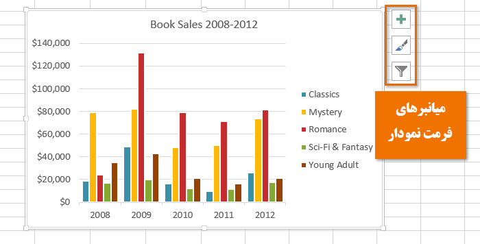 گاهی اوقات میخواهید نحوه دستهبندی دادههایتان را تغییر دهید. برای مثال در نمودار زیر، میزان فروش کتاب بر اساس سال دستهبندی شده است و هر ستون، ژانر آن کتاب را نشان میدهد.
