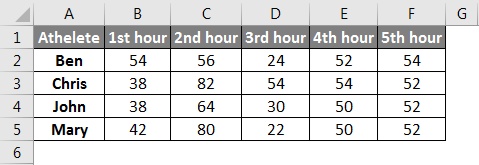 رسم نمودار x y z در اکسل نیز مانند نمودارهای بالا بسیار راحت است. این نوع نمودارها برای دادههای پیچیدهتر از نمودارهای 2 متغیره مورد استفاده قرار میگیرند. مثلا در جدول زیر فاصله طی شده توسط افراد به متر را در طول هر یک ساعت به مدت 5 ساعت، اندازهگیری کردهایم. با نگاه کردن به این اعداد نمیتوانیم درک کاملی از دادهها داشته باشیم اما با رسم نمودار خطی مقایسه ای در اکسل بهشکلهای مختلف، میتوانیم بهراحتی دادهها را مورد ارزیابی قرار دهیم.