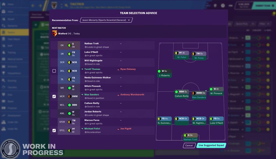 وقتی که یک بازیکن به آمادگی لازم رسید، میتوانید او را وارد تیم اصلی کنید، اما باید توجه داشته باشید که با این کار، تمام آمارها و اطلاعات پیشرفت او در بخش جوانان حذف میشوند و فقط این بازیکن را در کنار سایر بازیکنان اصلی خود خواهید داشت. این موضوع میتواند کمی آزاردهنده باشد، چون مشاهده سیر پیشرفت بازیکنان جوان از اهمیت زیادی برخوردار است. مثلا یک بازیکن 30 ساله مثل الکسیس سانچز که در اینترمیلان بازی میکند، دوره پیشرفت خودش را پشت سر گذاشته و لازم نیست او را از این جنبه زیر نظر بگیرید. اما یک جوان 18 ساله مانند میسن گرینوود از تیم منچستر یونایتد که تازه با لیگ برتر آشنا شده و آینده درخشانی هم در پیش دارد، باید به دقت زیر نظر گرفته شود.