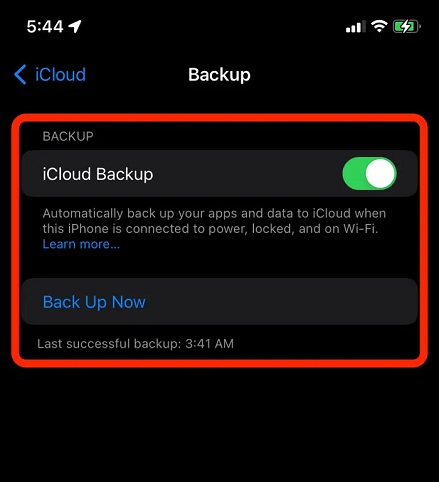 در صفحه بعدی مطمئن شوید گزینه iCloud Backup روشن است. در این صورت هر زمان که گوشی بدون استفاده، در حال شارژ و متصل به وایفای باشد، بهصورت خودکار از دادههای شما در آیکلاود بکاپ گرفته میشود.