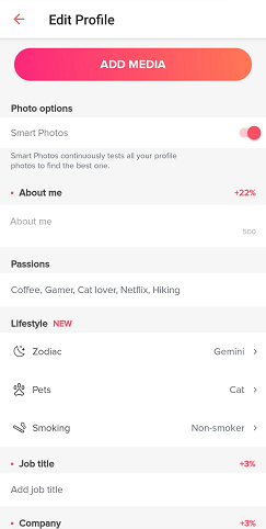 از اینجا میتوانید به پروفایل عکس اضافه کنید، بخش بیو و علایق را ویرایش کنید و در صورتی که صاحب حیوان خانگی هستید یا سیگار میکشید این موارد را در پروفایل ثبت کنید. همچنین میتوانید شغل خودتان را هم اضافه کنید.