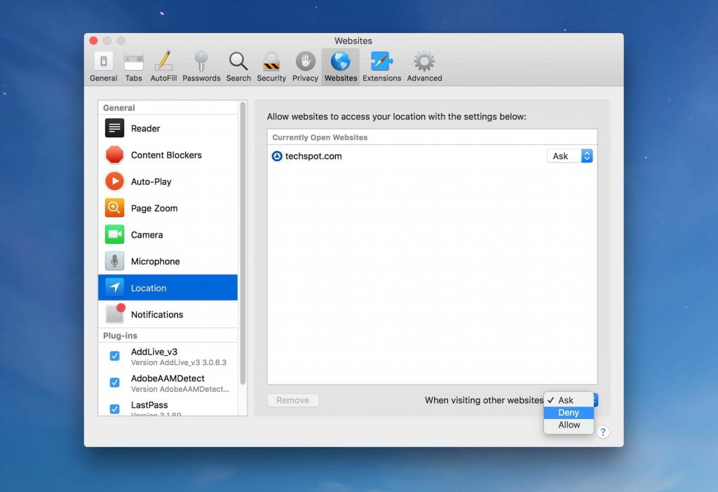 در قسمت Location، وبسایتهایی که اعلان موقعیت مکانی را نمایش میدهند را خواهید دید. برای غیرفعال کردن این امکان در تمام وب سایتها، در گوشه سمت راست پایین، گزینه «When visiting other websites» را به حالت «Deny» تغییر دهید.