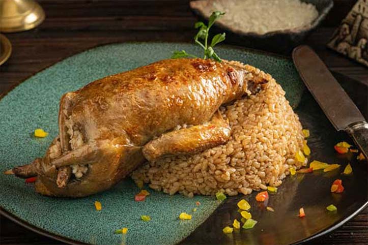 شکم کبوتر یا مرغ کباب شده با سبزی معطر، ادویه مخصوص مصر و بلغور گندم پر میشود.