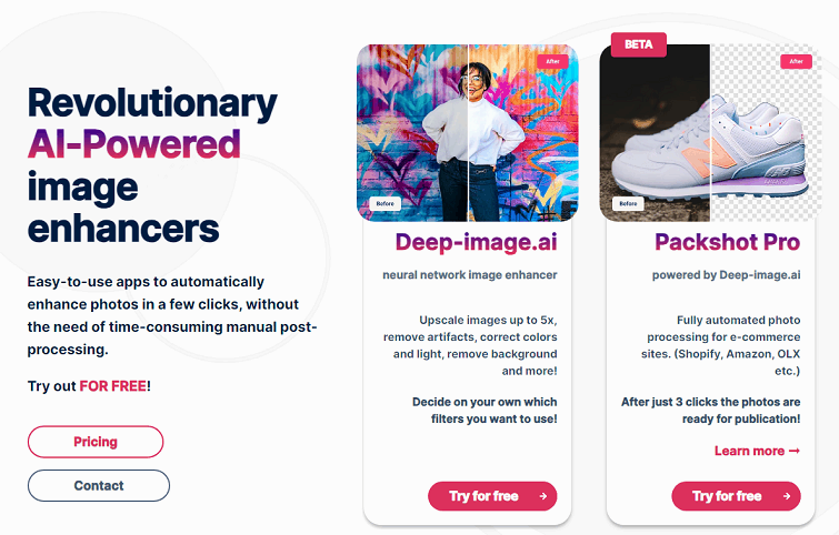 یکی از ابزارهای کارامد با رابط کاربری قابل قبول جهت با کیفیت کردن عکس با هوش مصنوعی، سایت Deep image AI است. در سایت deep-image.ai میتوانید عکسهای خود را از لحاظ نور و روشنایی و کیفیت با امکانات متنوع و مختلف سایت ویرایش و بهبود کیفیت دهید و پسزمینه یا اشیا داخل تصاویر را حذف یا محو کنید.