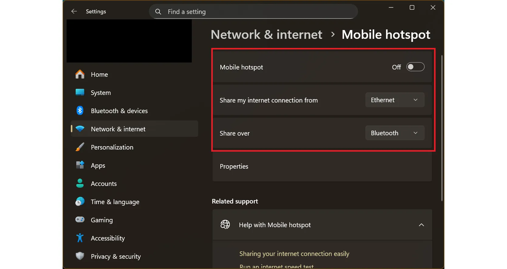 ابتدا Mobile hotspot را روی On قرار دهید و در قسمت Share my Internet connection from باید گزینه Bluetooth ،Wi-Fi یا Ethernet را انتخاب کنید، بسته به اینکه شما از چه نوع اتصال اینترنتی استفاده می کنید.