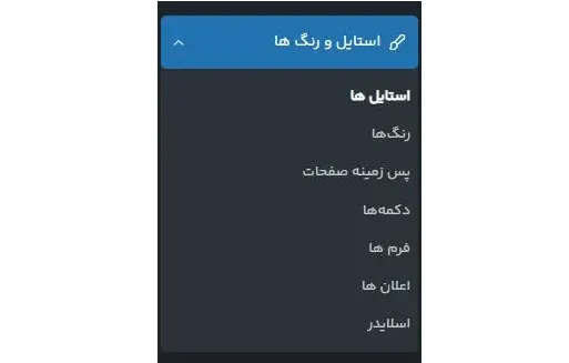 سپس در این بخش وارد صفحه ای خواهید شد که میتوان رنگ و استایل تمام صفحات سایتتان را سفارش سازی کنید، این بخش شامل مواردی مانند، استایل، رنگها، پس زمینه صفحات، دکمه، فرم و… است که در ادامه هر یک را جدا بیان خواهیم کرد: