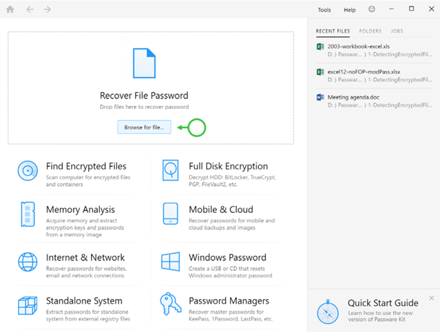 برای بازیابی رمز با این برنامه، ابتدا در صفحه اول روی گزینه Browse for file در قسمت Recover File Password بزنید.
