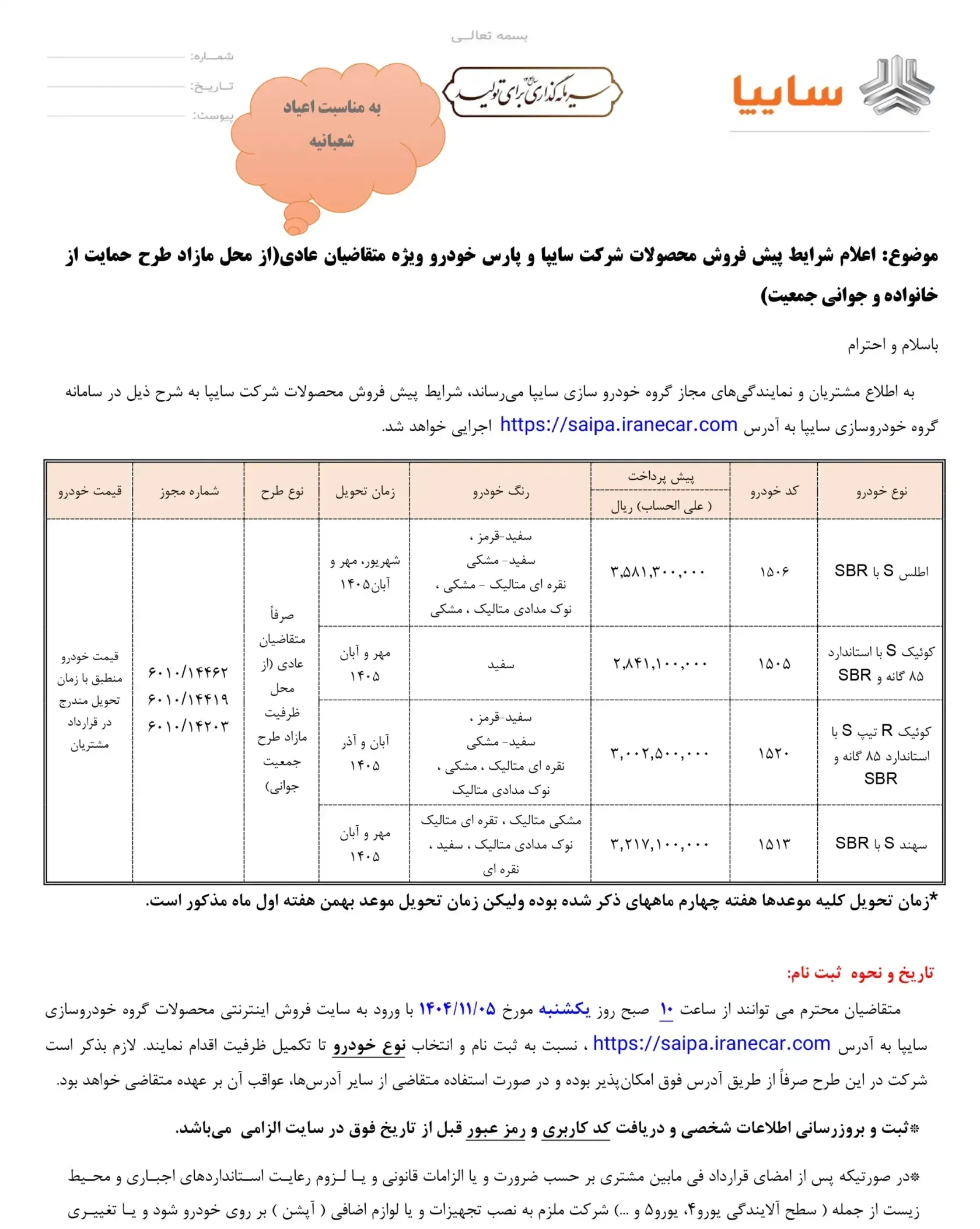 شرکت سایپا به مناسبت اعیاد شعبان، شرایط فروش جدیدی را برای متقاضیان عادی در بهمن ماه ۱۴۰۴ اعلام کرد. بر اساس این بخشنامه، چهار محصول «اطلس S»، «کوییک S»، «کوییک R تیپ S» و «سهند S» به صورت پیشفروش عرضه میشوند.