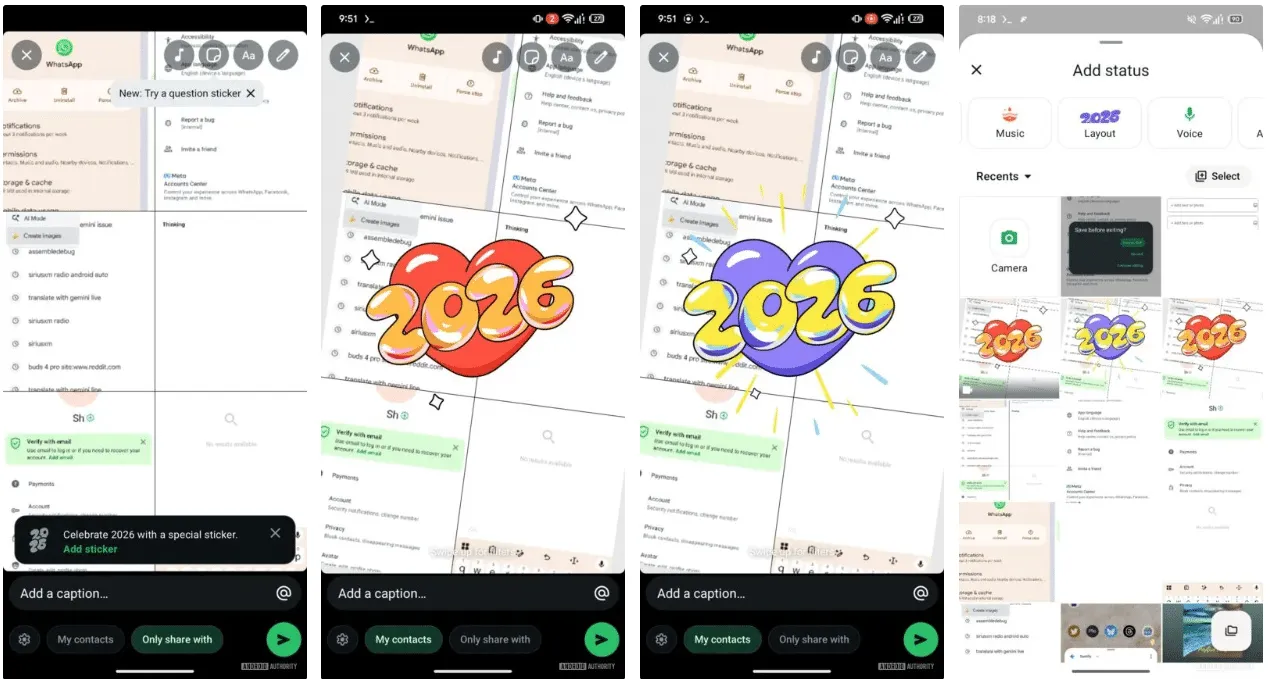 افزون بر این، واتساپ در حال آمادهسازی یک استیکر متحرک با طراحی عدد ۲۰۲۶ است که در رنگهای سبز، قرمز و بنفش ارائه خواهد شد. این استیکر هنگام ساخت استاتوسهای چندتصویری یا Layout قابل استفاده است و با توجه به ماهیت مناسبتی آن، احتمالاً پیش از آغاز سال جدید میلادی (اوایل دی ۱۴۰۴) عرضه میشود.